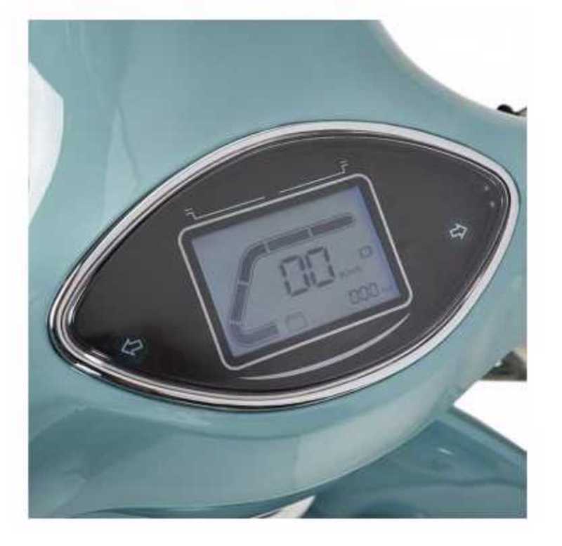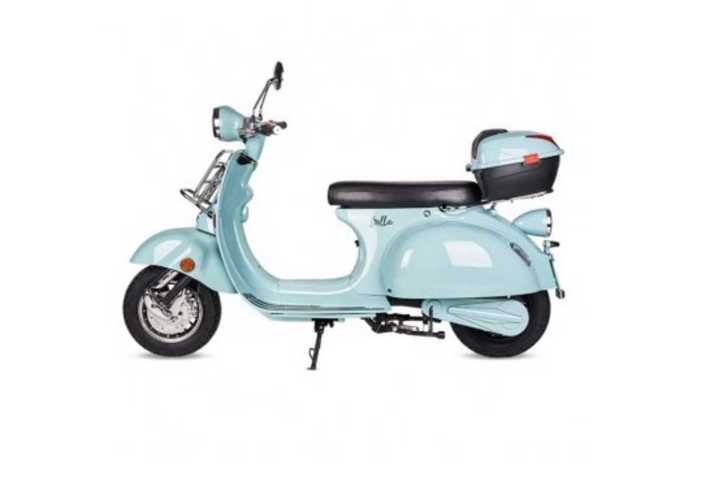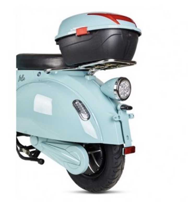 Además de su potencia y su atonomía, tiene el diseño vintage estilo Vespa y un poquito ancha. Cuenta con retrovisores que hacen juego con el color del scooter, incluye luz LED frontal para una mayor visión nocturna y un maletero en la parte posterior..