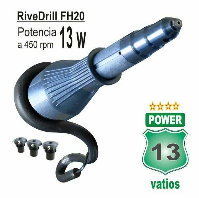 Remachadora RiveDrill FHE20 con una mano libre, carrera de 20 mm con remaches desde 3 a 5 mm de diámetro patentado y fabricado en España. Remacha sin ...esfuerzo, sin cables y sin mangueras con el mismo taladro con el que has hecho el agujero para poner el remache. Se instala como una broca. La única con protector real de la mano. Contiene caja, instrucciones y 3 bocas . Taladro no incluidoShow more