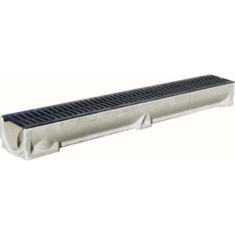 Canal Self100 altura 95mm con Reja Pasarela de Fundición Clase B125 Canal de drenaje ACO SELF 100 H95 de hormigón polímero, de clase de carga hasta B1 ...25 según EN1433. Sin reja. Con sistema de fijación por pestaña. Con una sección interior de 70 cm². Con premarca de salida vertical DN/OD 110. Longitud total 1000 mm, altura exterior 95 mm y ancho exterior 118 mm. Ancho Interior nominal 98 mm. Peso: 6,6 kg.