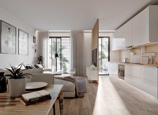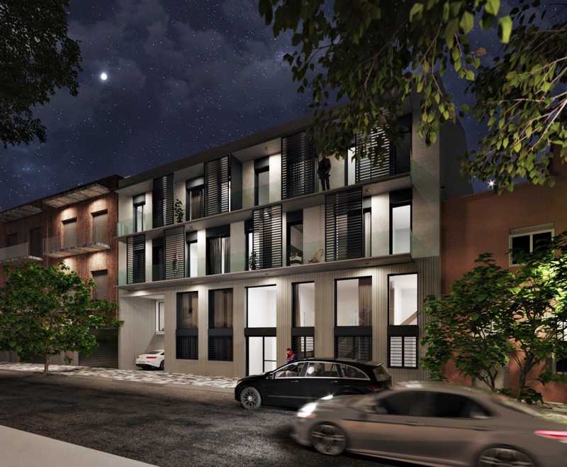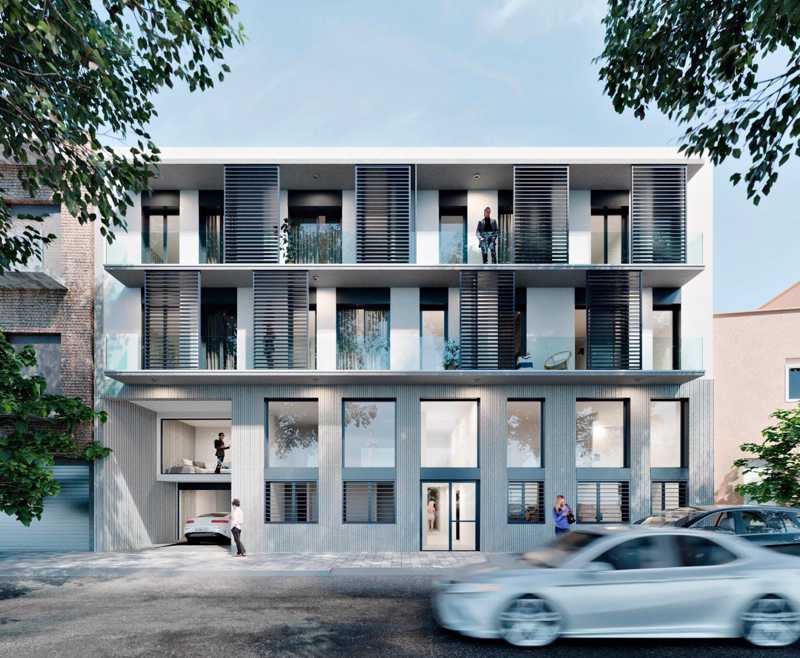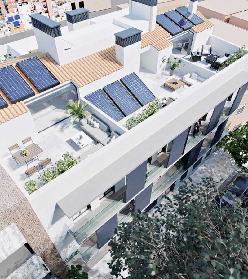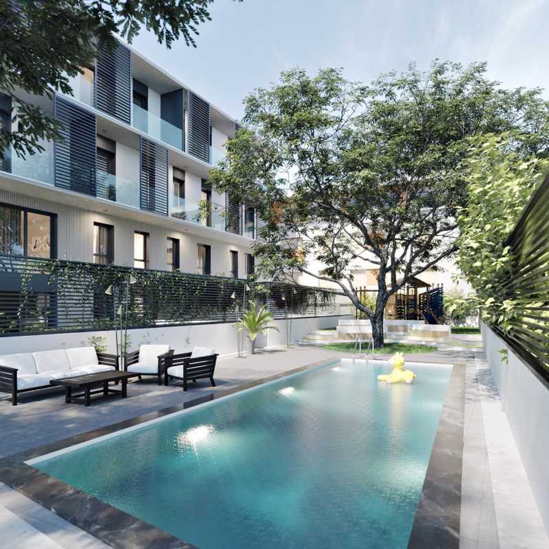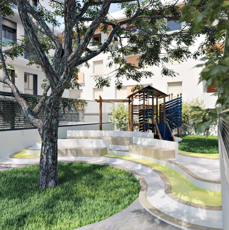 11 unidades residenciales de uno a tres dormitorios, zona con piscina, solarium y jardín comunitario, incluyendo área de juegos infantiles, en el patio interior del edificio.