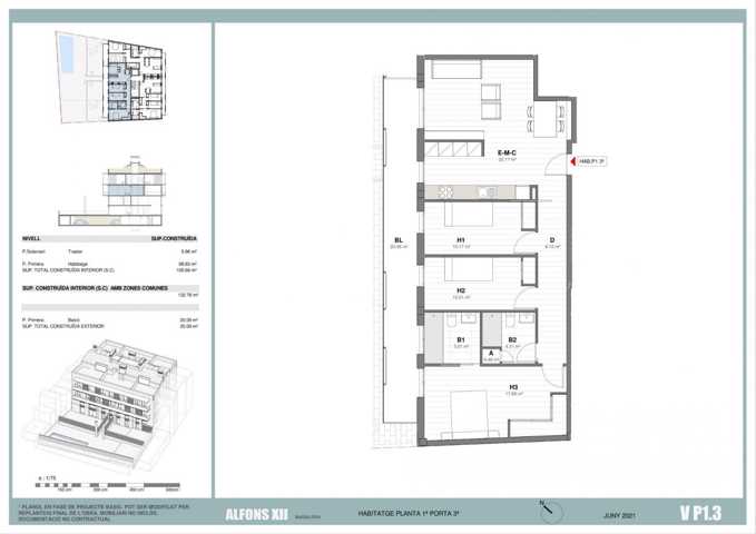 Planta PRIMERA, PUERTA 3ª: vivienda 99 m2 con salón-comedor-cocina, 3 habitaciones dobles y 2 baños completos. Todas las estancias excepto los baños t ...ienen salida directa a la terraza.
