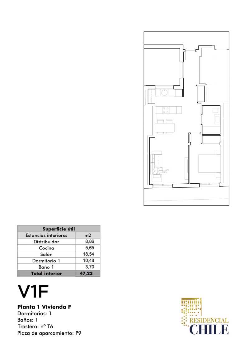 Esta vivienda en planta primera consta de un 1 dormitorio independiente exterior a la calle Colombia, con vistas al parque (orientación Este), 1 baño completo con plato de ducha, salón-comedor de 24 m2, también exterior con balcón, con cocina americana e isla central que divide ambos espacios. Operación sujeta a IVA (10%). Incluye 1 plaza de garaje y trastero.