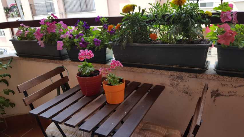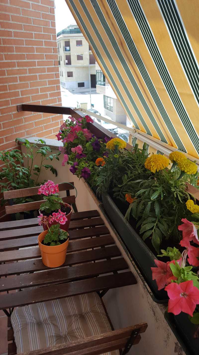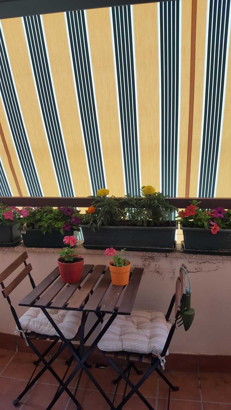 El pequeño balcón accesible desde el salón es un espacio que gracias al toldo instalado ofrece privacidad y es un agradable lugar donde relajarse, o tomar un aperitivo.