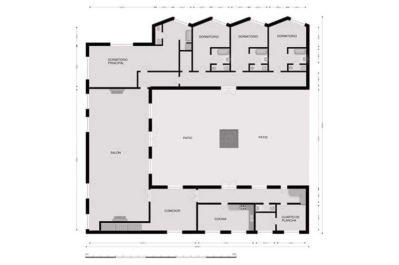 •Un gran salón, diáfano, de 200 m², con techos altos, dos bonitas chimeneas y con acceso directo al patio central. El salón es perfecto para realizar recepciones de gran aforo.