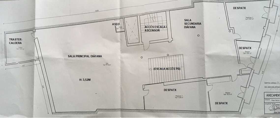 Oficines diàfanes, ubicat a planta primera amb accés comercial a peu de carrer. Es distribueix amb a ...ccés a peu de carrer amb escala emblemàtica ( disposa de accés comuntiari amb ascensor i rampta d´accés adaptat per accés de minusvàlids) que ens condueix a la sala princial diàfana de quasi 180m2, el qual està serparat amb un traster-zona de caldera, 1 aseo i 4 despatxos.