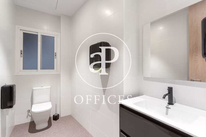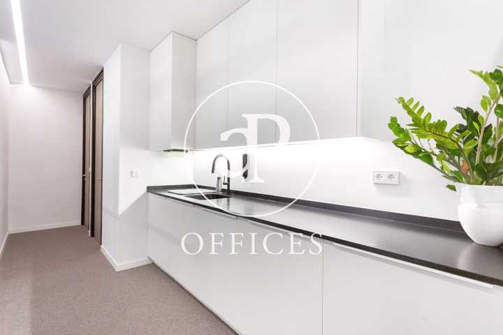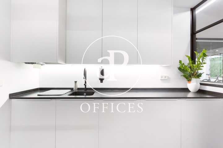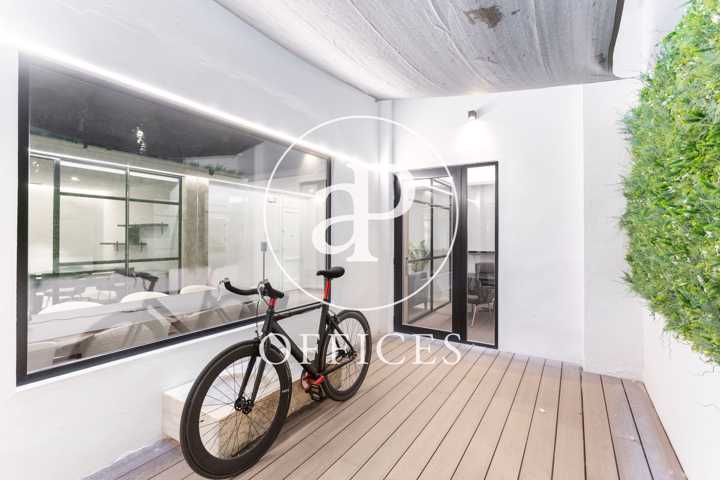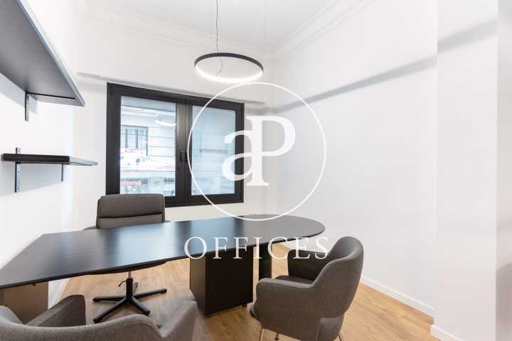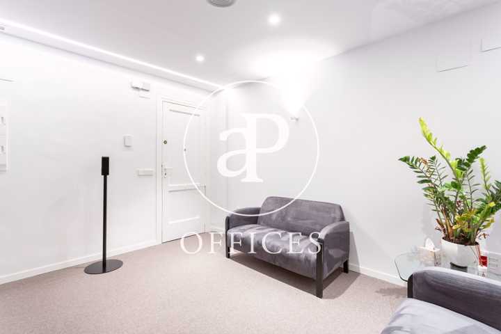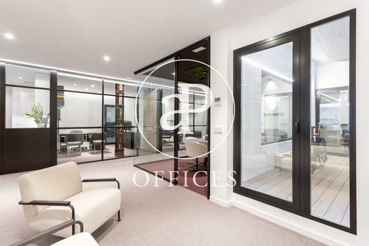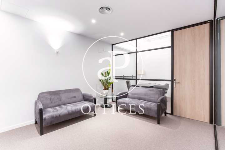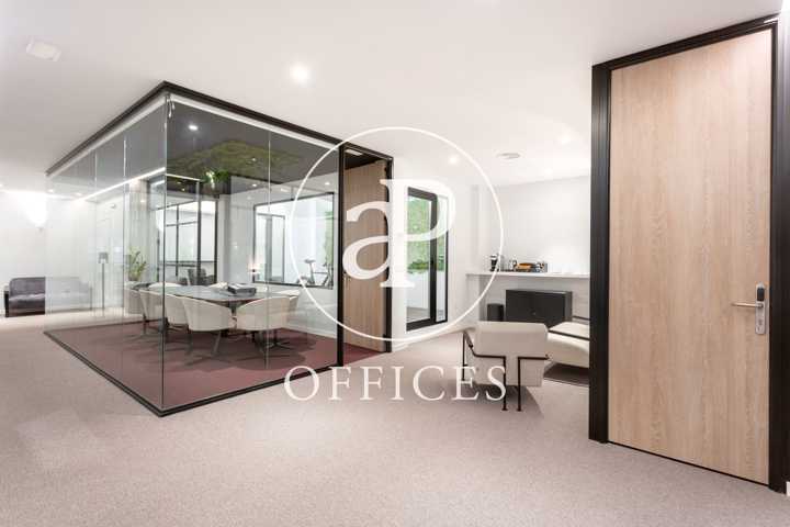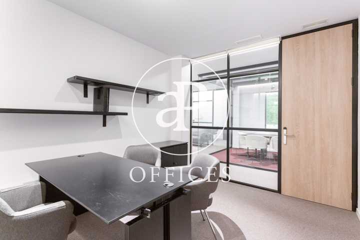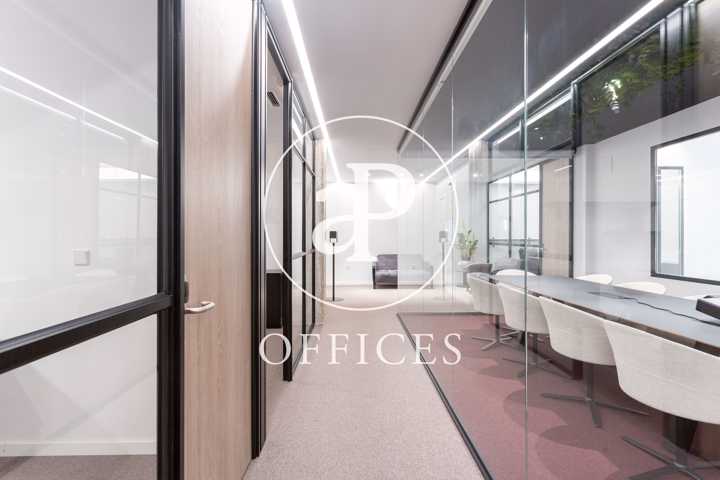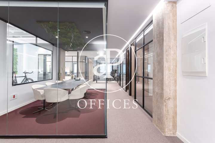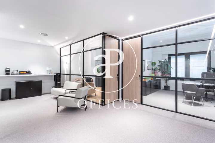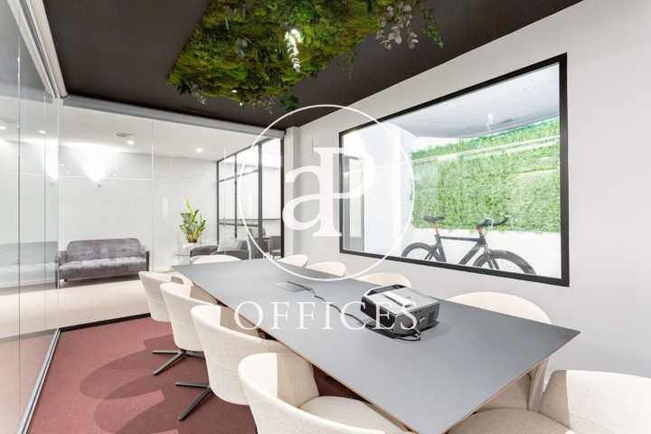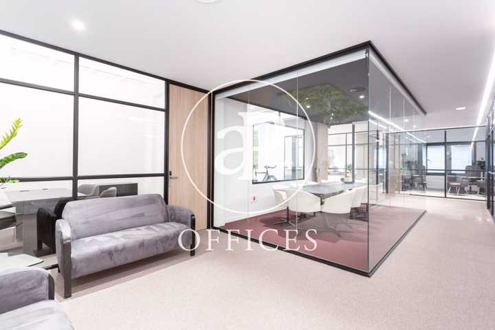 Está recién reformada, con las mejores calidades y un diseño moderno. Los espacios están separados por mamparas de cristal, que tienen integradas estores. La sala de juntas está preparada con proyector y pantalla, con espacio para diez personas.