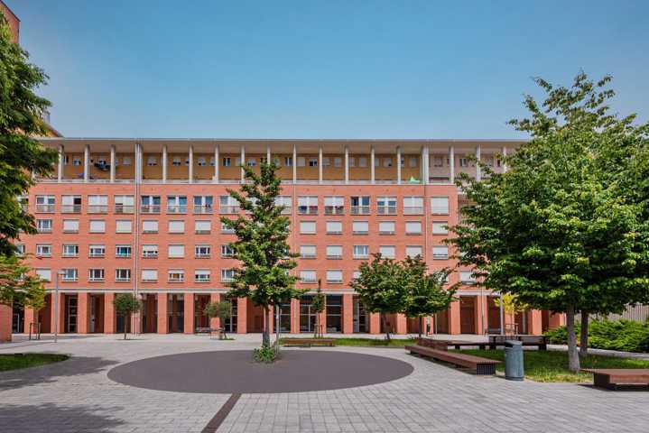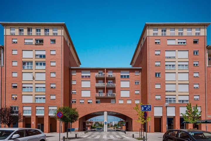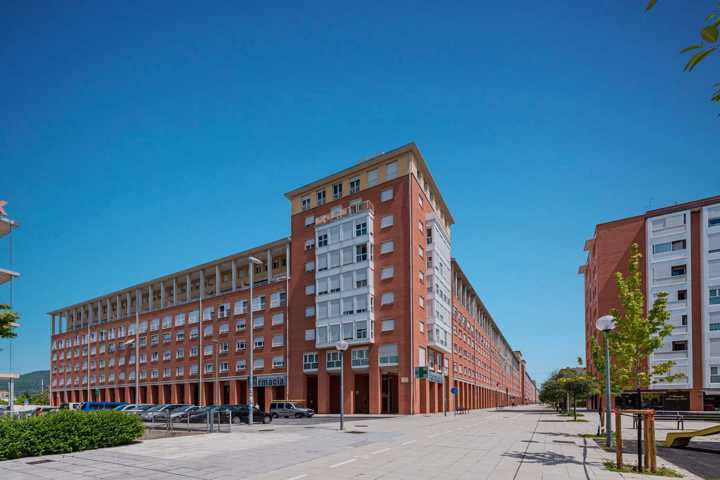 Edificio residencial en el barrio pamplonés de San Jorge, cuenta con 6 alturas, estando la planta baja ocupada por zonas comunes, y locales comerciales.
