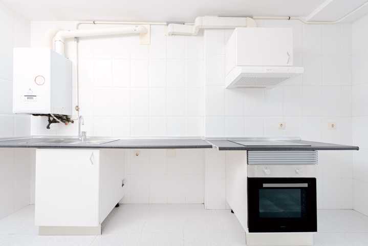 Cocina parcialmente equipada con horno, campana y vitrocerámica.