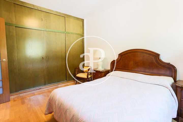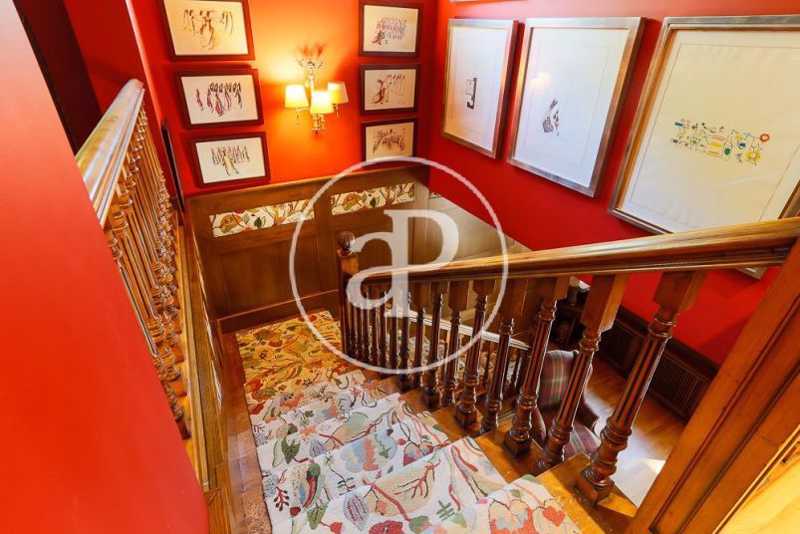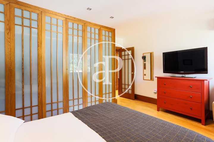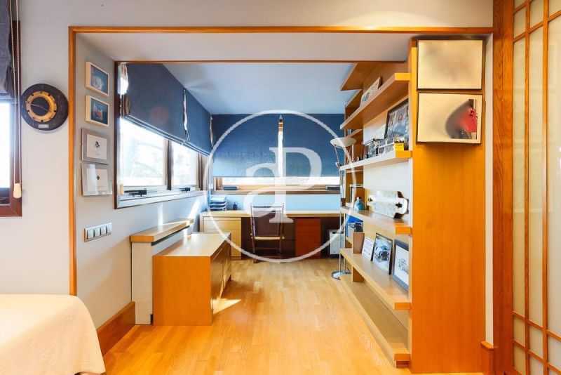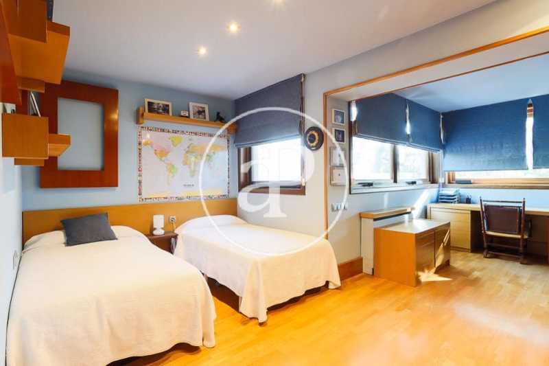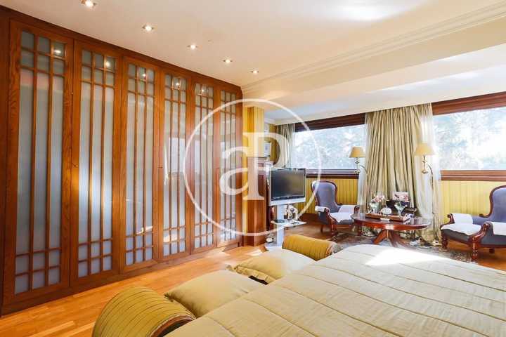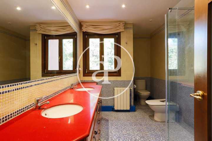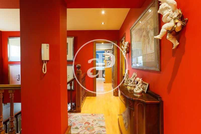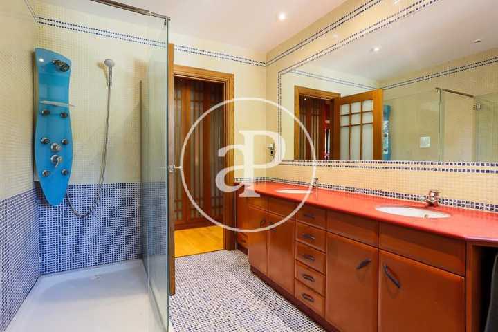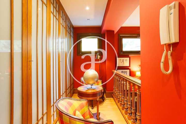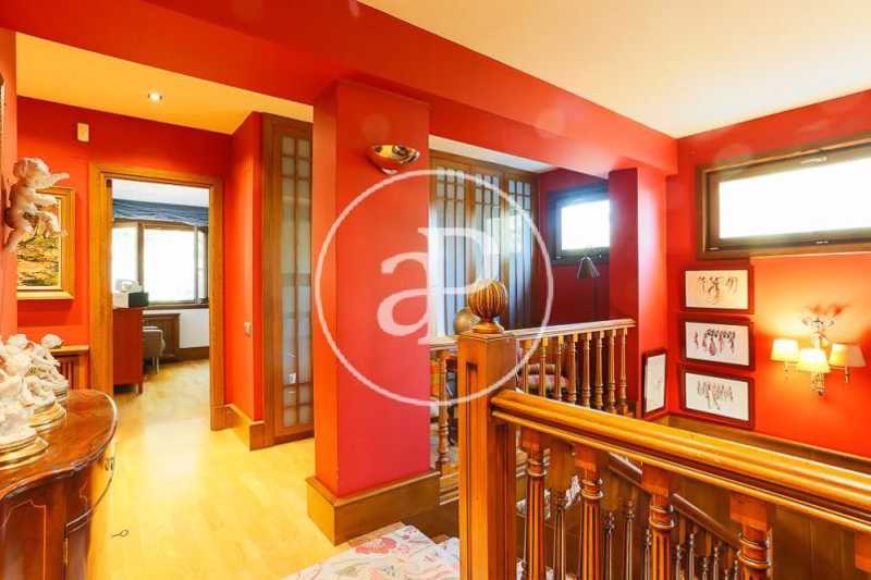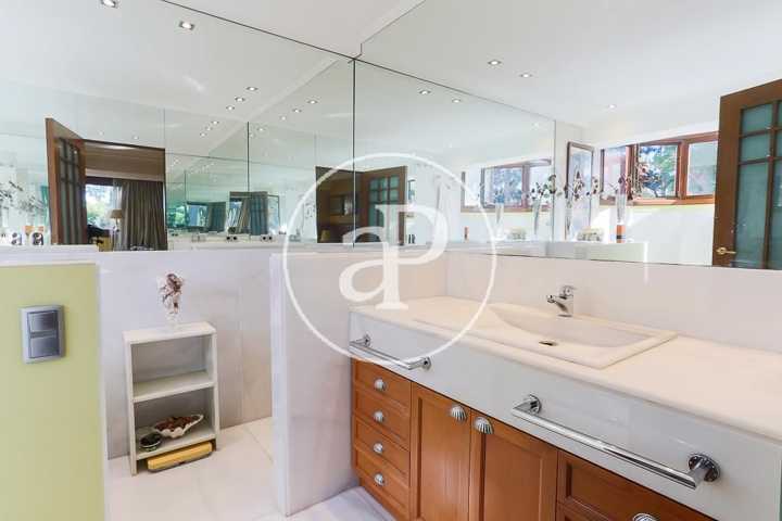 Una cómoda escalera, desde el espacioso recibidor de la casa, da paso a la planta superior donde se encuentra la zona de noche, que converge en un distribuidor con una zona de butacas junto a varios armarios empotrados. La habitación principal, muy amplia, contiene una zona destinada a salón con ventanales de madera eléctricos abatibles, como en el resto de la casa, y está dotada de múltiples armarios empotrados. El cuarto de baño completo in suite goza de una gran ducha en gresite con ventanas que asoman al jardín que aportan abundante luminosidad. En la planta superior encontramos, a su vez, un espacioso baño completo y dos habitaciones dobles adicionales, una de las cuales, de grandes dimensiones, dispone de una amplia zona de estudio. Ambas estancias cuentan con ventanales eléctricos de madera abatibles y extensos armarios empotrados vestidos de excelente calidad.