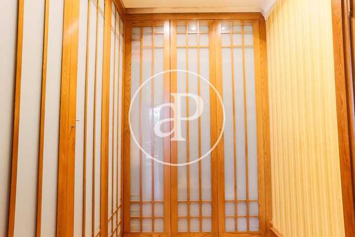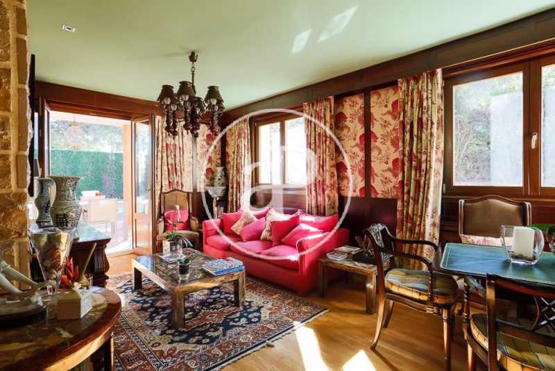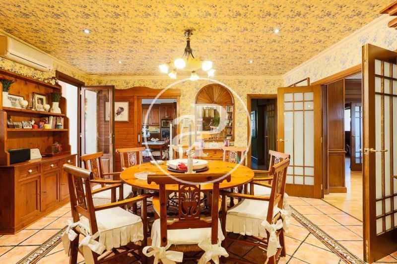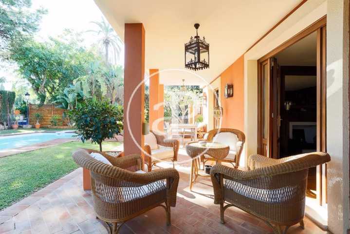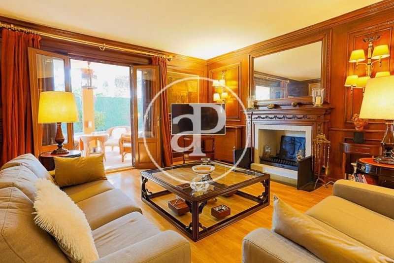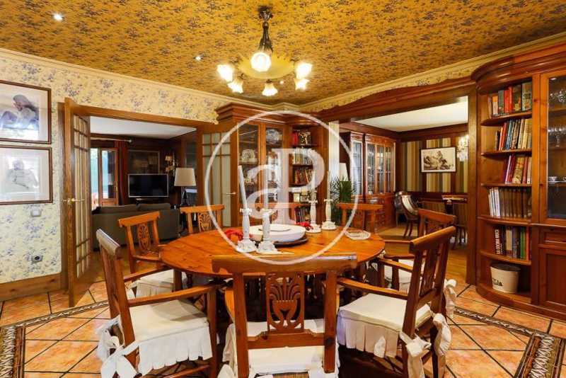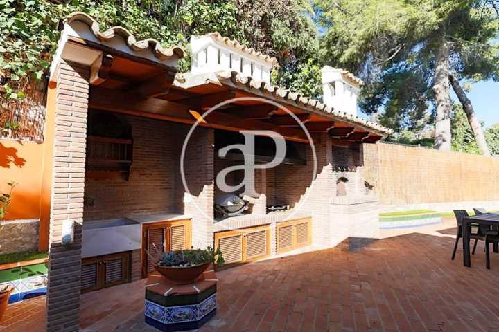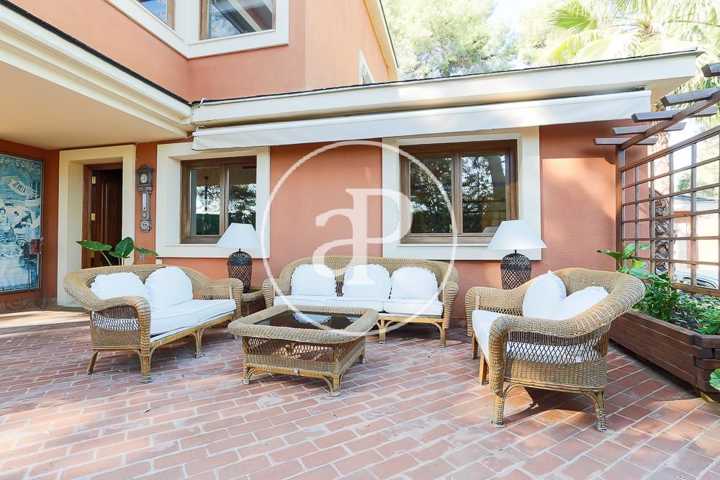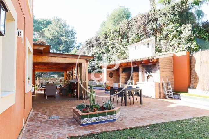 La planta baja de la casa dispone de dos magníficos salones unidos, uno de ellos panelado con maderas nobles, librerías de calidad, chimenea y suelos de parquet. Ambas estancias se comunican, a su vez, a través de un amplio hueco con cerramiento, con sendos comedores. Uno de ellos, más señorial y con salida a la terraza. Esta terraza, de grandes dimensiones, está techada con vigas y cerramientos de madera, acristalada y con la posibilidad abrirse en su totalidad al jardín. Esta estancia constituye un gran salón-comedor exterior acristalado en invierno y abierto en verano. Se trata de una zona muy agradable y confortable de la casa junto a la que se encuentra situado un magnífico paellero/barbacoa que garantizará el disfrute de cualquier velada en cualquier época del año.
