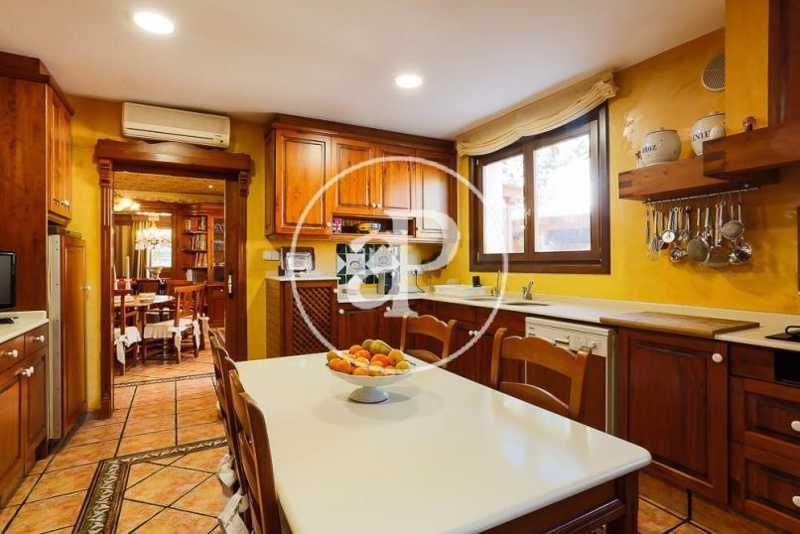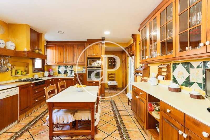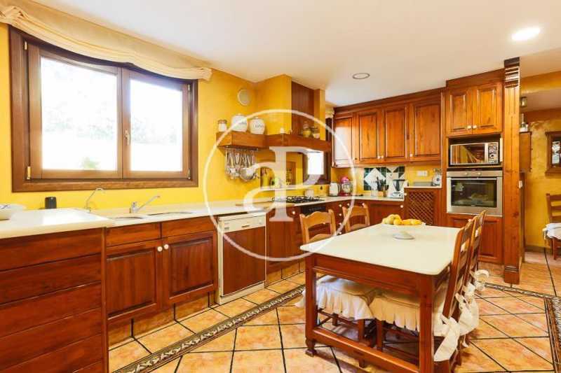 El segundo comedor, con paredes y techo revestidos en papel pintado, es muy amplio y con salida directa al jardín. Está concebido para su uso diario y se sitúa junto a la cocina. La cocina es de estilo rústico, espaciosa y con capacidad para ubicar una holgada mesa. Se encuentra unida a un área de servicio que cuenta con un dormitorio con armarios empotrados y un cuarto de baño completo en gresite. Además la zona de servicio posee una entrada independiente desde el exterior.