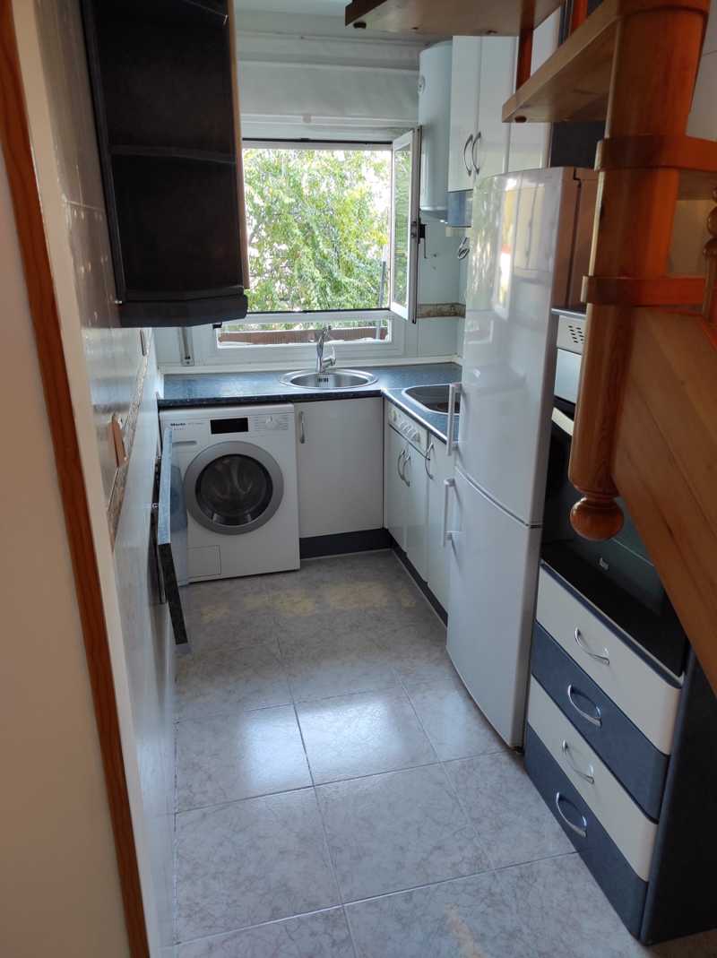 Cocina amueblada con electrodomésticos y salón independiente con una coqueta terraza. Bomba de calor-frío.