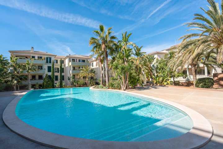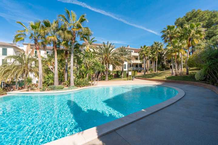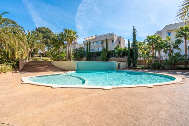 Urbanización privada con amplias zonas ajardinadas y piscina exterior.