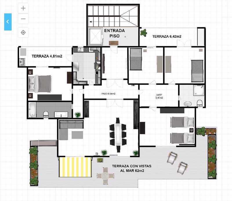 ✔ Tiene una gran terraza de 62 metros cuadrados, con jardineras ☘ y toldo.