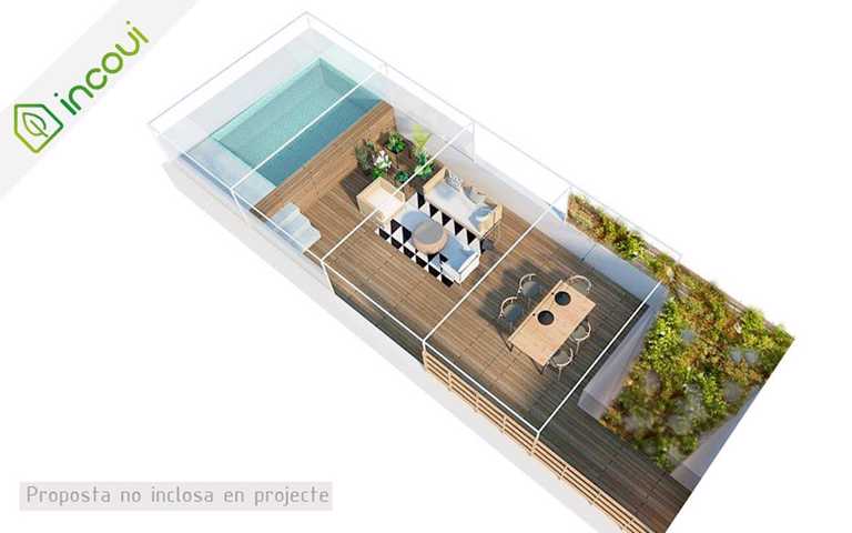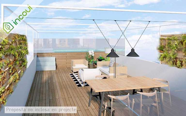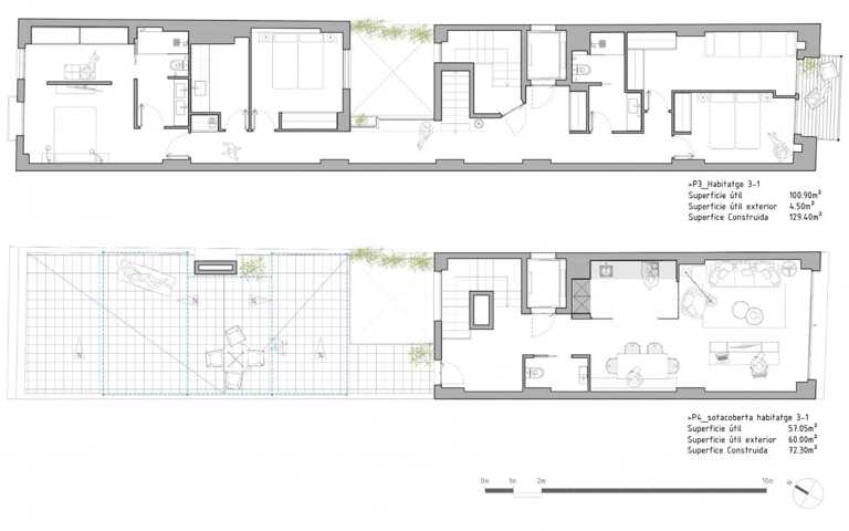 Tiene una superficie construida total de 201,70 m2, distribuidos en dos plantas. La superficie útil de la planta inferior es de 100,90 m2 y contiene la zona de noche, distribuida en cuatro habitaciones dobles -una de ellas con vestidor y baño-, un segundo baño, un lavadero y la escalera de acceso a la planta superior. Esta tiene una superficie útil de 57,05 m2 y se distribuye en comedor-estar, cocina, un baño y el distribuidor que da acceso a la terraza, de 60 m2. El ascensor del edificio es de bajo consumo y llega directamente dentro del recibidor del piso, comunicando igualmente las dos plantas del dúplex. La configuración de la vivienda facilita la ventilación cruzada, que se verá favorecida por el jardín vertical del patio interior.
