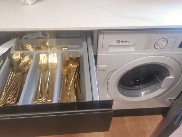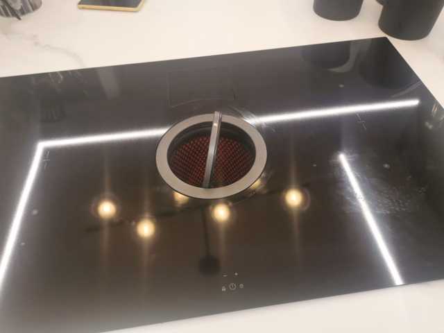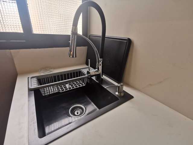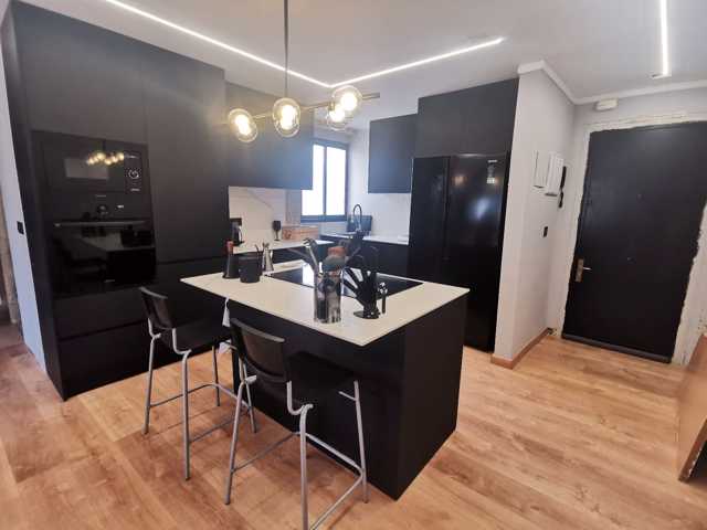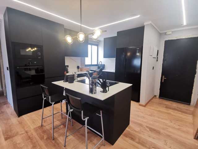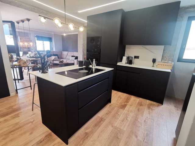 Cocina con todos los detalles que puedas imaginar. Extractor incrustado. Todos los electrodomésticos de primeras marcas panelados en negro como el resto de los muebles. Frigorífico de dos cuerpos. Encimeras y alicatado de la cocina porcelanico.