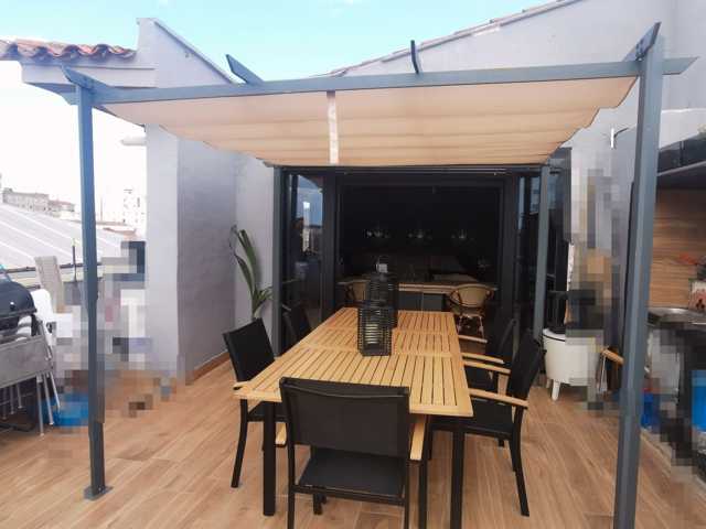 Y la guinda. Una terraza de mas de 25 metros. Con suelos de gres imitación madera. Gran pérgola fijada al suelo. Barbacoa, frigorífico, vinoteca y fregadero para tener todo al alcance.