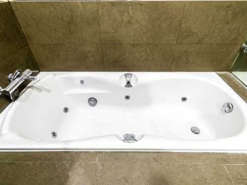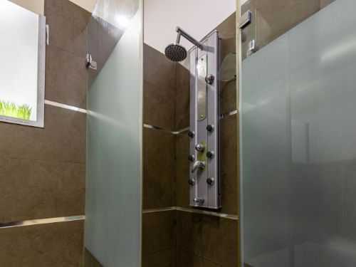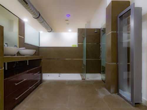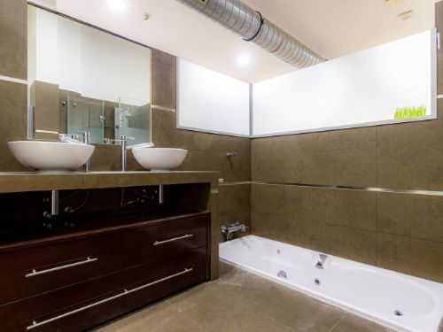 El baño está totalmente revestido en baldosa porcelánica color marrón, dispone de un moderno lavabo con 2 senos, una bañera de hidromasaje y un plato de ducha con mampara y columna de hidromasaje y está totalmente integrado en la habitación en suite.