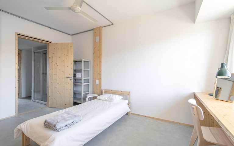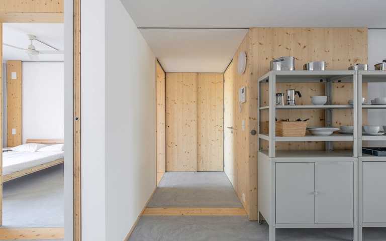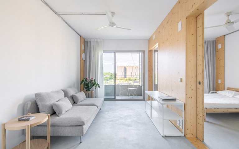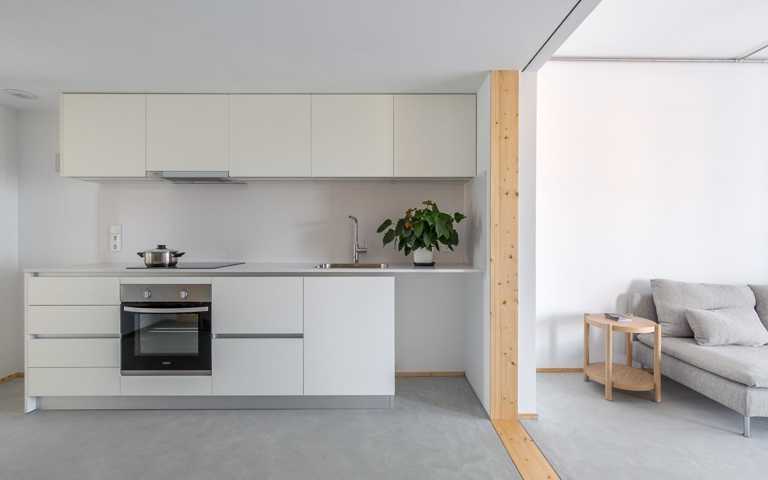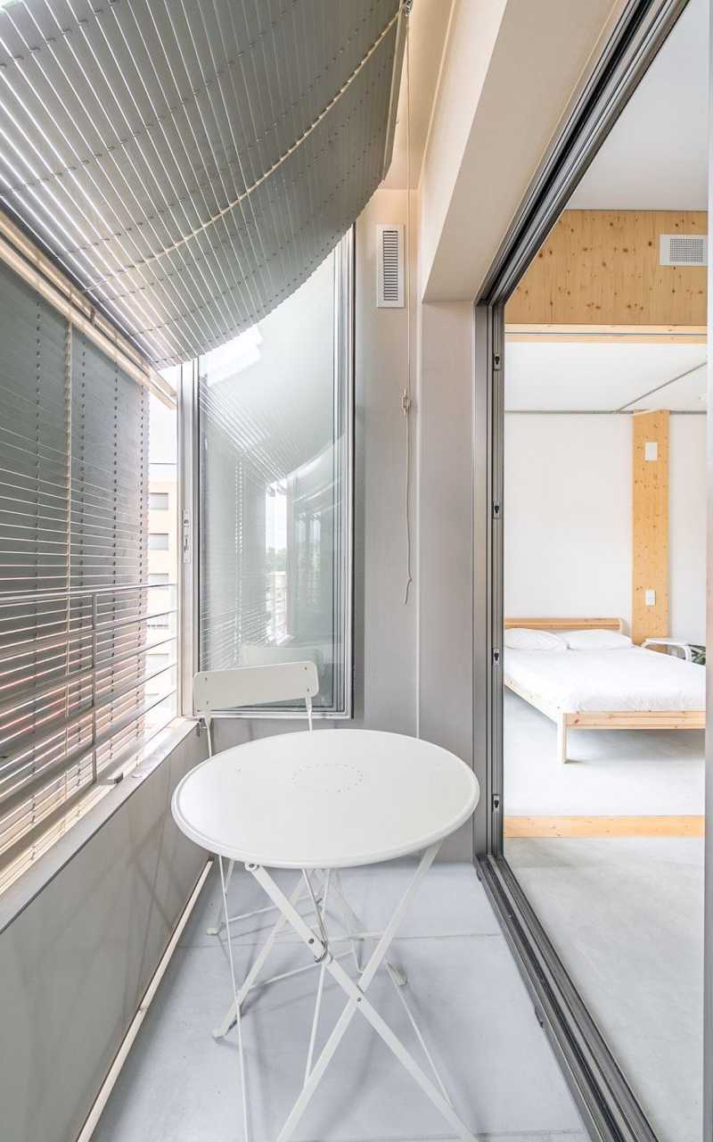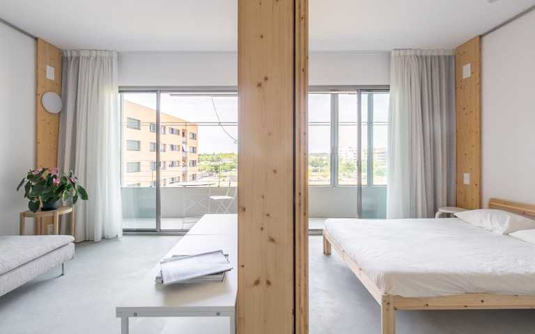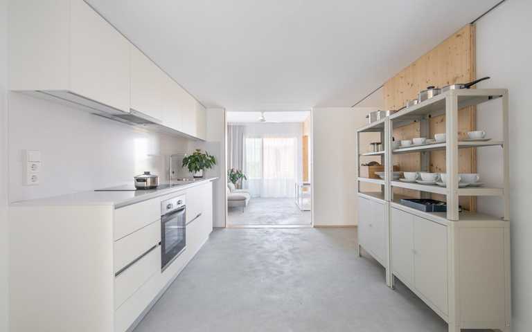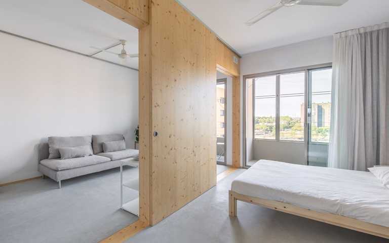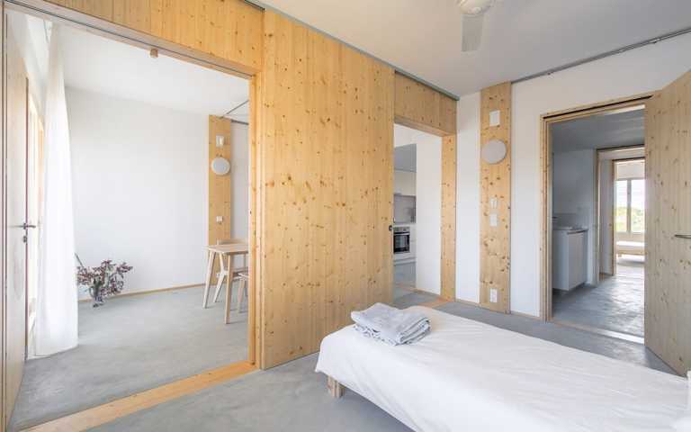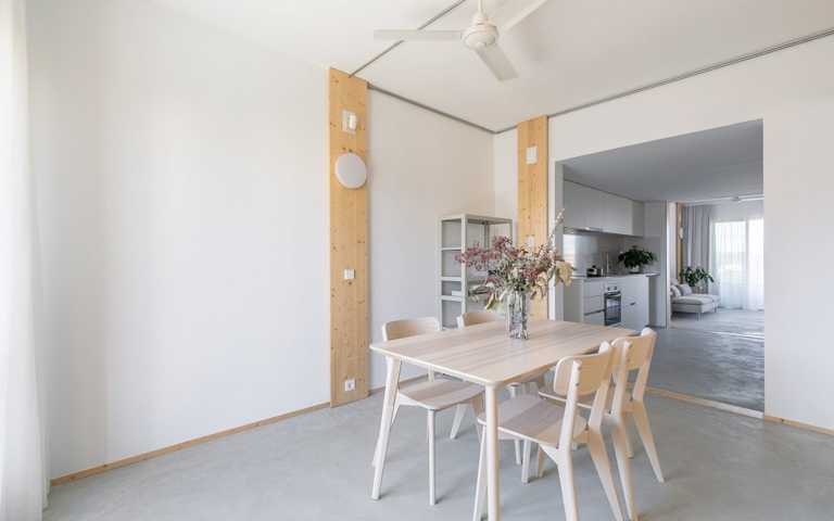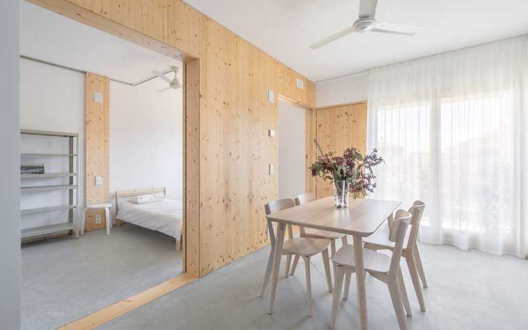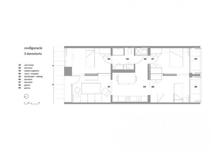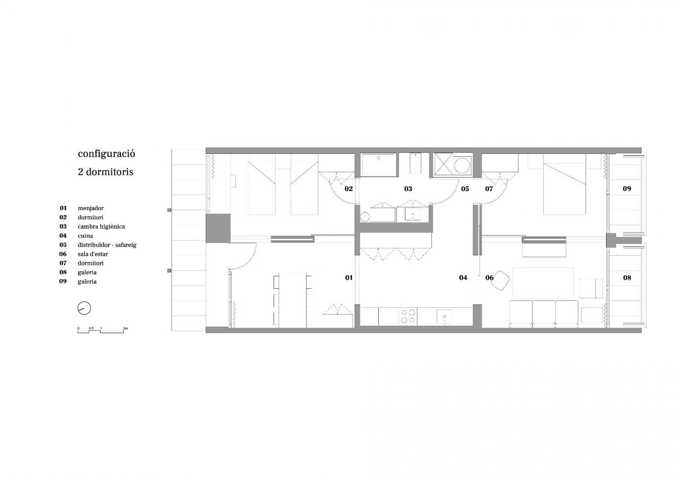 La distribución se basa en la ubicación de la cocina y el baño en la zona central. A partir de aquí hay cuatro estancias de 12m2 que se pueden conectar o independizar sin hacer obras según el uso que se le quiera dar: dormitorio, estudio, sala, ... Al lado sur hay dos galerías de 2.85 m2 que son terrazas en verano y tribunas en invierno.