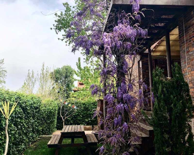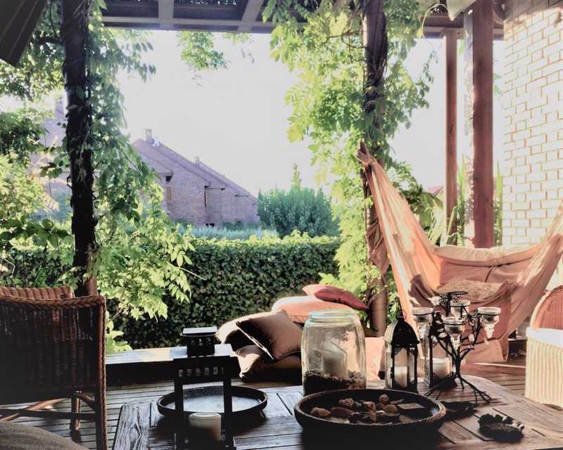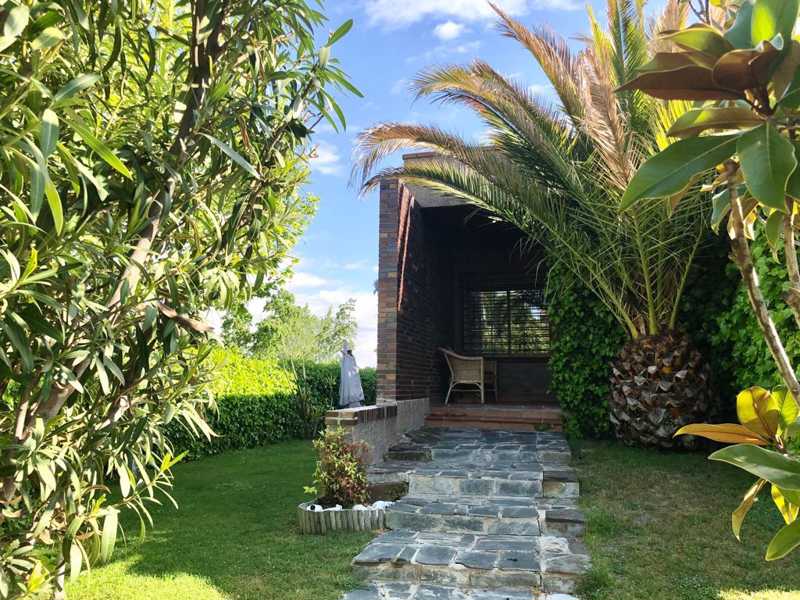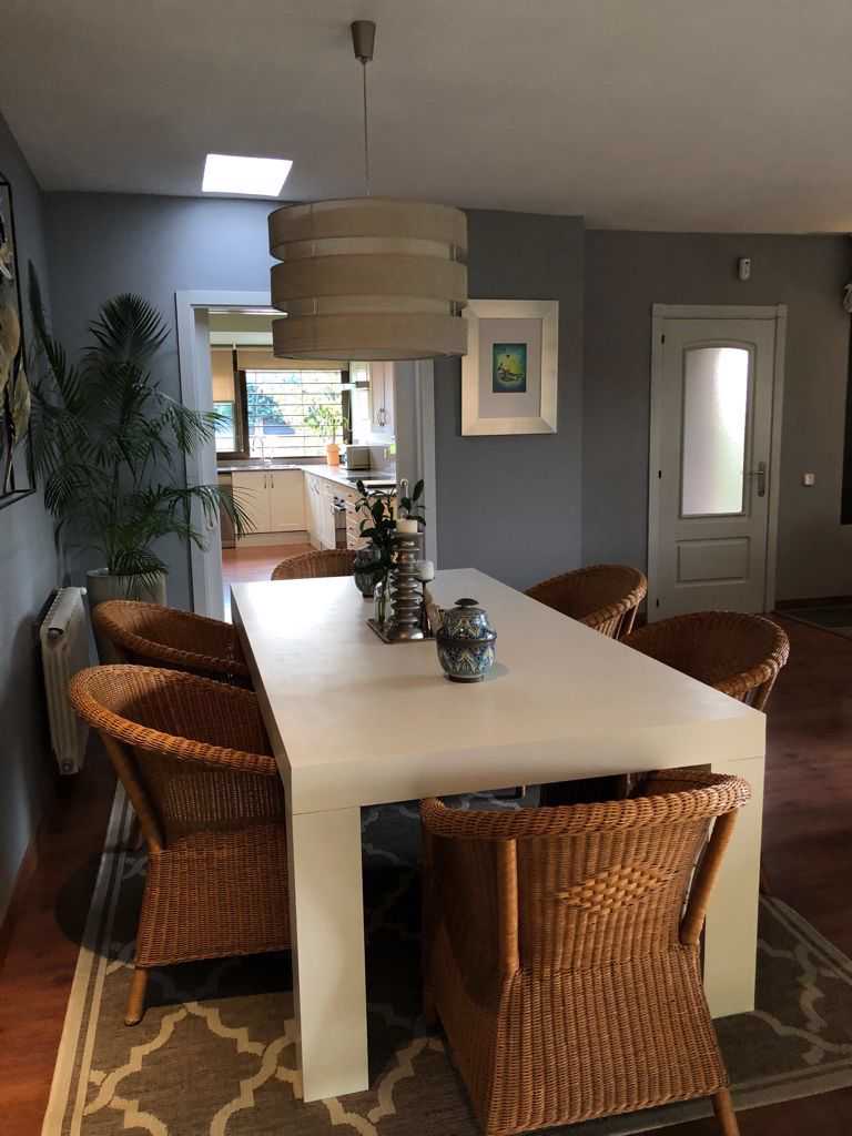 Desde la calle se accede a la vivienda (puerta acorazada) por un amplio hall o distribuidor desde el que entramos al salón que cuenta con una bonita chimenea y cuenta con un amplio comedor. Desde el salón se accede a un gran porche cubierto, con suelo de madera, abierto al jardín con una bonita pérgola desde donde se pueden contemplar unos espectaculares atardeceres. En esta misma planta se encuentra una amplia y moderna cocina que se separa del salón con unas puertas correderas.