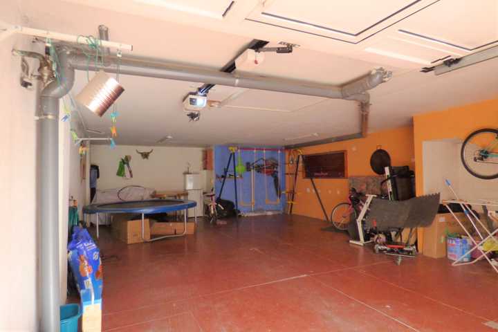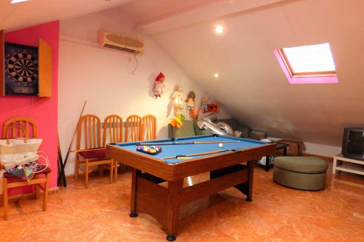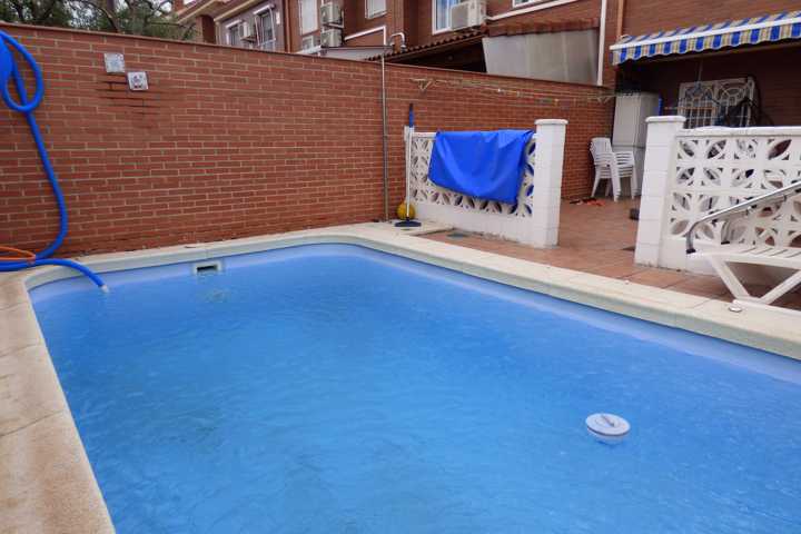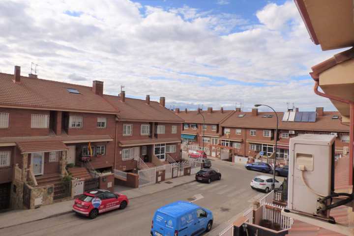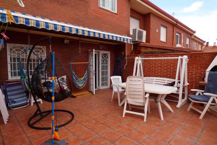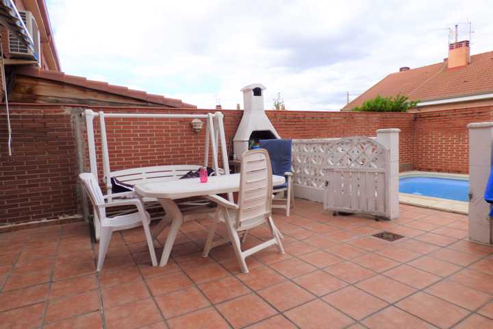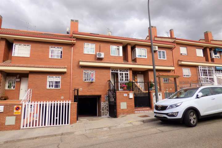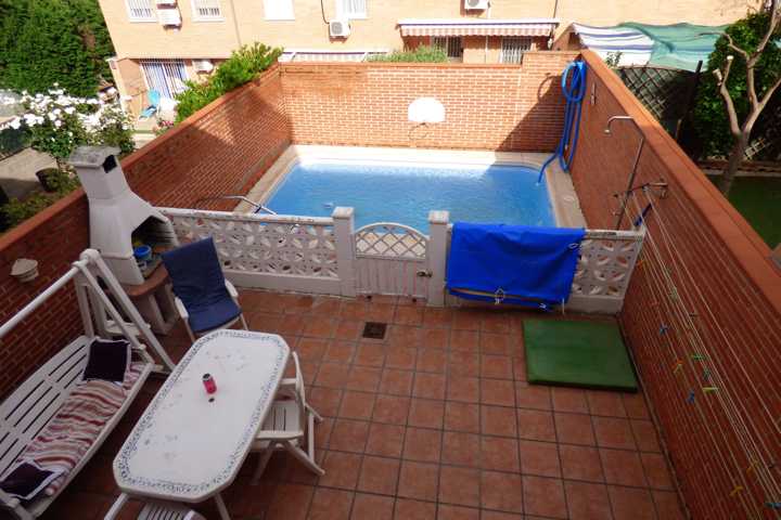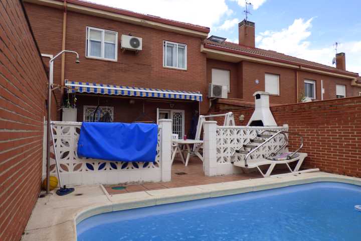 Chalet en Perales del Rio (Getafe). Chalet adosado de 4 plantas, buhardilla abierta y acondicionada. DISTRIBUCION: Planta BAJA; hall de entrada, cocin ...a con sitio suficiente para comer, salón comedor con chimenea, acceso a terraza acristalada, y barbacoa y cocina cerrada, escalera interior, aseo. Planta PRIMERA: 4 dormitorios con armarios empotrados, 2 baño completo. Planta SOTANO: Aparcamiento para 3 coches y puerta automática. La vivienda tiene una antigüedad de 22 años y está en buen estado de conservación. Dispone de calefacción individual y agua caliente sanitaria es mediante caldera mixta de gas natural. Doble ventana con carpintería de aluminio lacado en blanco con vidrio doble, hojas correderas, con rotura de puente térmico y mosquiteras. Los solados son de baldosa cerámica en planta baja y baños, planta primera parqué de espiga. Pintura gotelé en color, puertas de roble. Vivienda sin gastos de comunidad. El patio trasero de 60 m2, solado y con piscina particular, toldo. Muchas mejoras.
