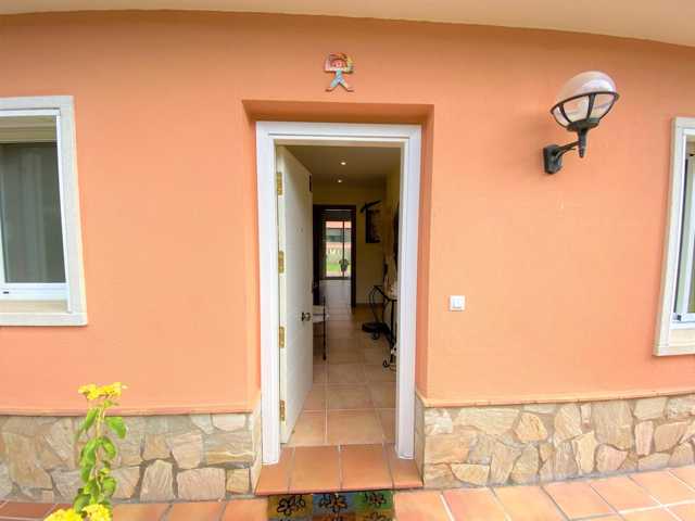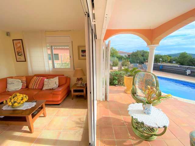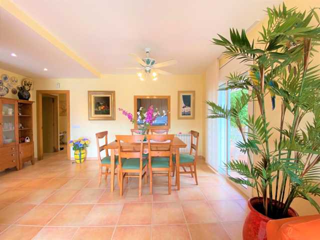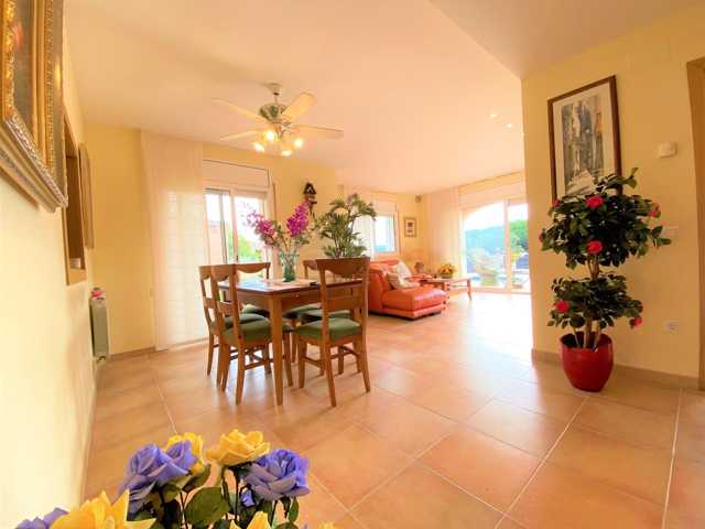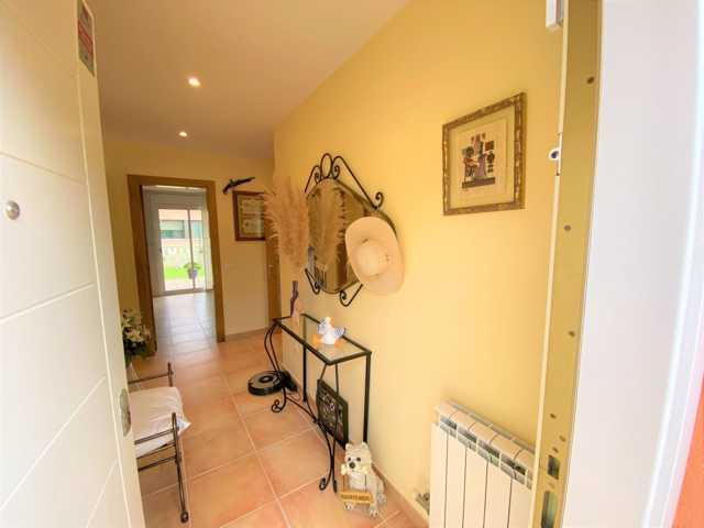 Está distribuida en salón comedor con salida a la terraza, unos grandes ventanales que aportan gran luminosidad a la casa, amplia cocina independiente con salida al porche con zona barbacoa fantástica y un jardín con una piscina de 28m2 con limpiafondos incorporado.