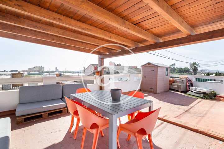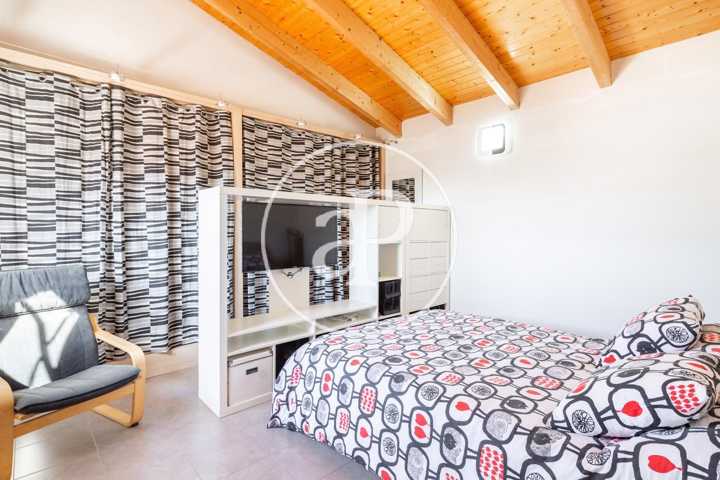 La parte alta, el techo está acabado en madera, lo que le da un aire nórdico, en esta planta existe una amplia terraza para tomar el sol.