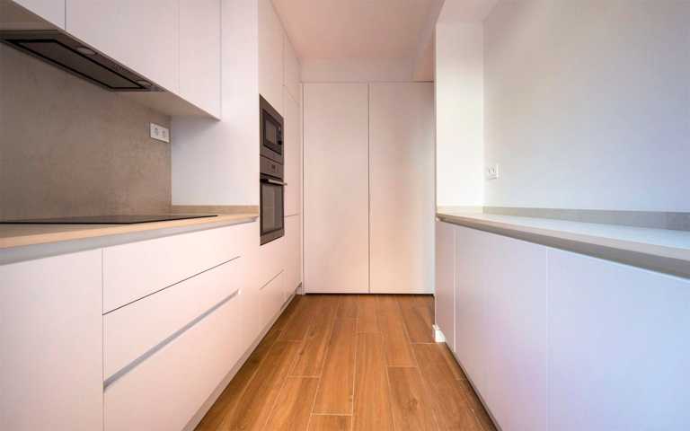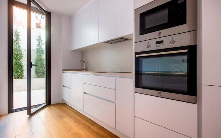 Cocina independiente con salida al jardín, de líneas rectas, amueblada y con electrodomésticos panelados (nevera y lavavajillas), encimera de Silestone Zeus/white y placa de inducción, horno y microondas. Incluye armario con espacio para lavadora y secadora y la máquina de Aerotermia.