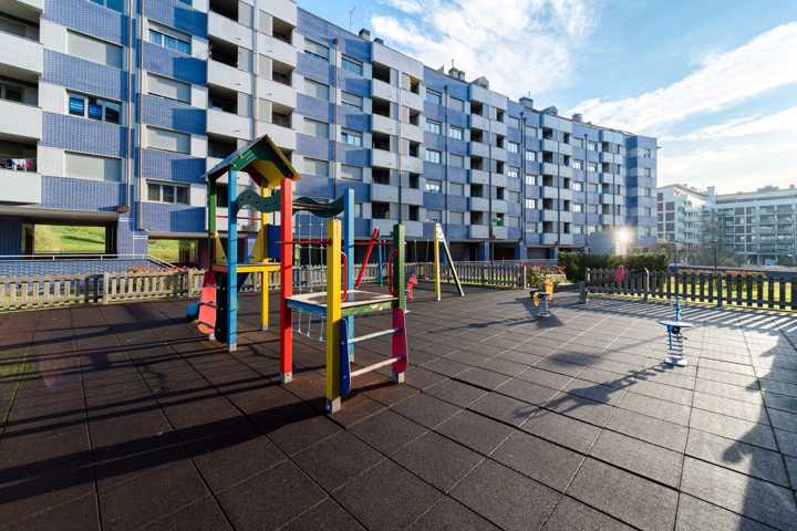Zonas comunes ajardinadas con zona infantil de juegos.